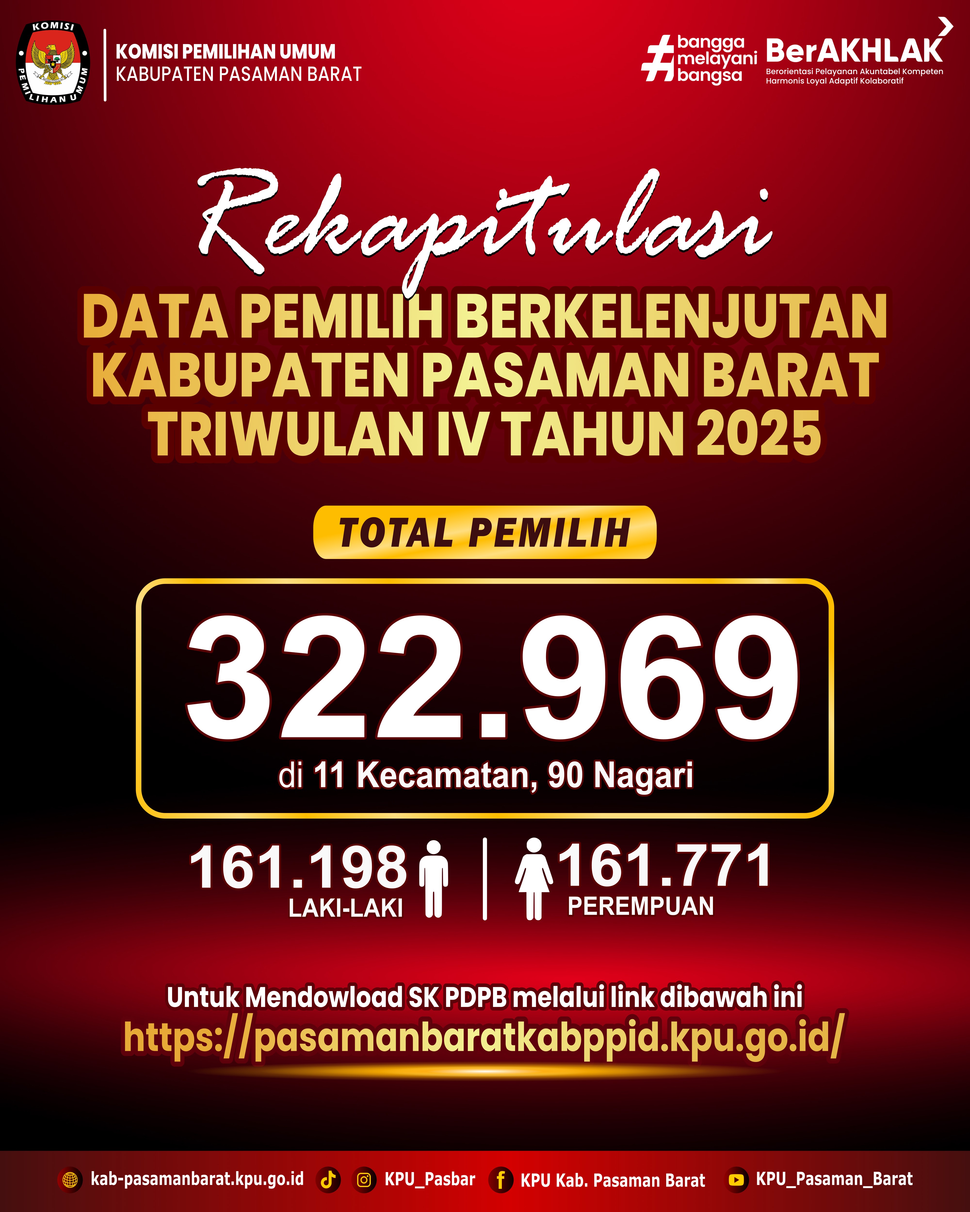 KPU Kabupaten Pasaman Barat melaksanakan Rapat Pleno Terbuka Penetapan Pemutakhiran Data Pemilih Berkelanjutan (PDPB) Triwulan IV Tahun 2025, bertempat di Ruang Rapat Kantor KPU Pasaman Barat, Senin (08/12/2025).