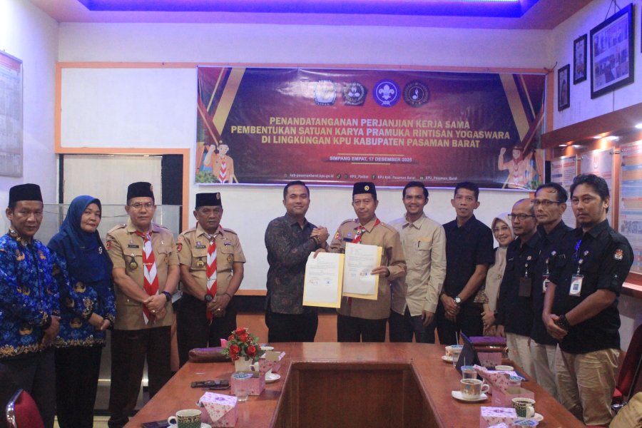 Simpang Empat, kab-pasamanbarat.kpu.go.id – KPU Kabupaten Pasaman Barat melaksanakan penandatanganan Perjanjian Kerja Sama antara Komisi Pemilihan Umum Kabupaten Pasaman Barat dan Kwartir Cabang 0317 Gerakan Pramuka Pasaman Barat dalam rangka pembentukan Satuan Karya (Saka) Pramuka Rintisan Yogaswara. Kegiatan ini berlangsung di Kantor KPU Kabupaten Pasaman Barat pada Rabu (17/12/2025).