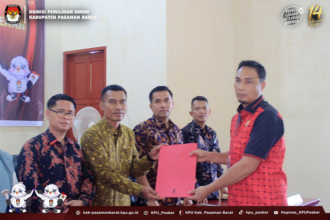 Rombongan kepengurusan partai PDI Perjuangan diterima oleh Ketua KPU Kabupaten Pasaman Barat, Alharis dan Anggota KPU Kabupaten Pasaman Barat Alfi Syahrin, Wanhar, Adri dan Misdarliah bersama Sekretaris KPU Kabupaten Pasaman Barat, Zaidi, didampingi Kasubbag Zamzami, Puput, Hidayat Basri, dan Yulia WN dan jajaran sekretariat serta disaksikan oleh Bawaslu Kabupaten Pasaman Barat, di Aula Kantor KPU Kabupaten Pasaman Barat.