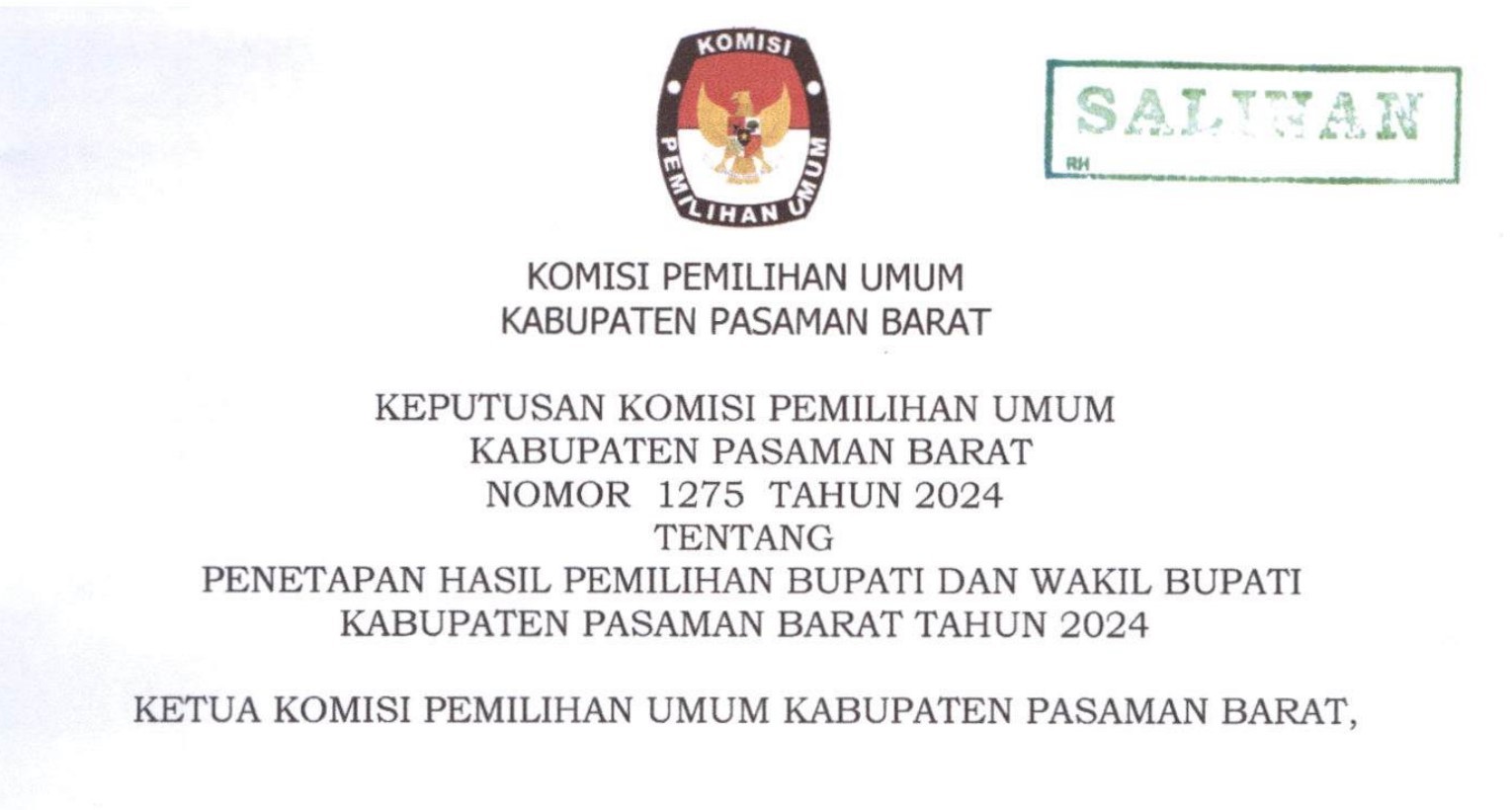 KPU PASAMAN BARAT MENETAPKAN HASIL PEMILIHAN BUPATI DAN WAKIL BUPATI KABUPATEN PASAMAN BARAT TAHUN 2024 Selasa, 03 Desember 2024 23:00 951 DOWNLOAD DISINI Bagikan: Dilihat 951 Kali.