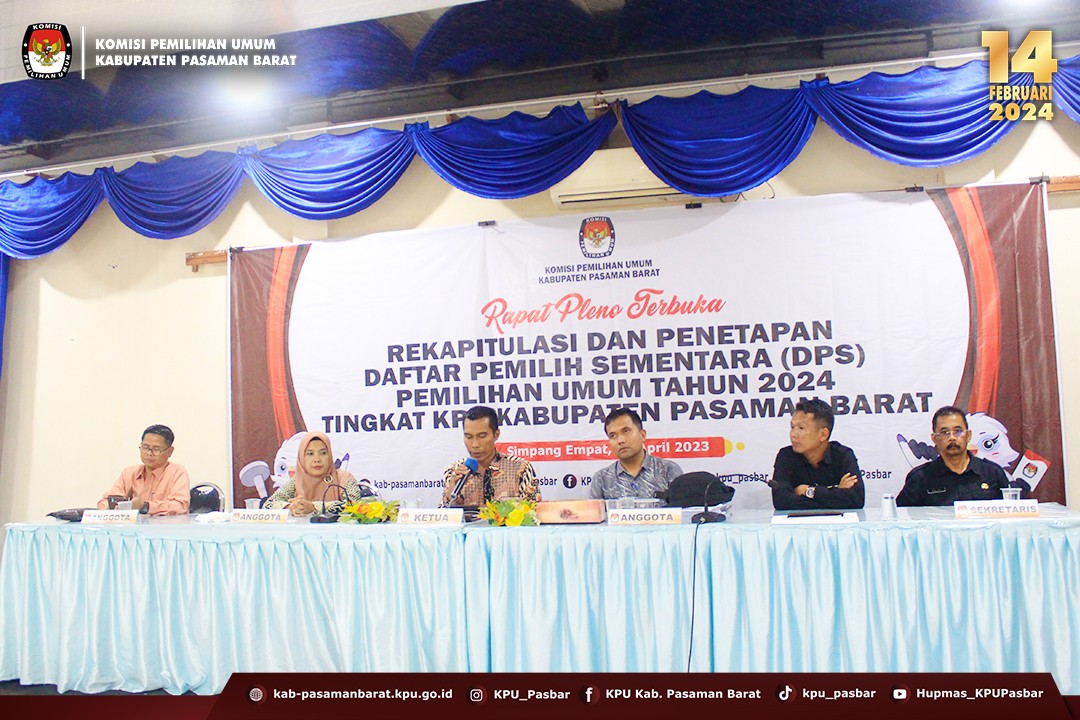 Rapat dibuka oleh Ketua KPU Kabupaten Pasaman Barat, Alharis. Dalam sambutannya Alharis menyampaikan pelaksanaan Rapat Pleno Terbuka Rekapitulasi DPS untuk Pemilihan Umum tahun 2024 merupakan amanat PKPU Nomor 7 Tahun 2023 tentang perubahan atas PKPU Nomor 2 Tahun 2022 tentang Penyusunan Daftar Pemilih Dalam Penyelenggaraan Pemilihan Umum dan Sistem Informasi Data Pemilih, serta Surat Keputusan KPU Nomor 27 Tahun 2023 tentang Pedoman Teknis Penyusunan Daftar Pemilih Dalam Negeri pada Penyelenggaraan Pemilihan Umum.