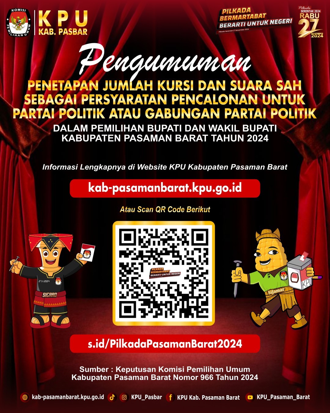 KEPUTUSAN KOMISI PEMILIHAN UMUM KABUPATEN PASAMAN BARAT NOMOR 966 TAHUN 2024 TENTANG PENETAPAN JUMLAH KURSI DAN JUMLAH SUARA SAH SEBAGAI PERSYARATAN PENCALONAN UNTUK PARTAI POLITIK ATAU GABUNGAN PARTAI POLITIK DALAM PEMILIHAN BUPATI DAN WAKIL BUPATI PASAMAN BARAT TAHUN 2024
