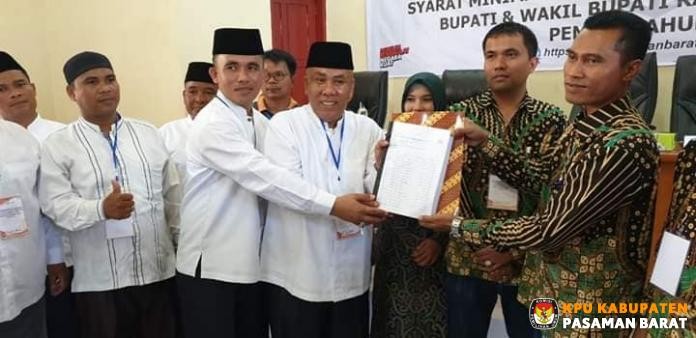 Simpang Empat, kab-pasamanbarat.kpu.go.id -- Komisi Pemilihan Umum (KPU) Kabupaten Pasaman Barat menerima dokumen dukungan bakal pasangan calon perseorangan untuk Pemilihan 2020 yakni pasangan H Agus Susanto SH, MH dan H Rommy Candra, Kamis (20/2/2020). Pasangan ini menyerahkan dokumen dukungan yang tercatat pada Sistem Informasi Pencalonan (Silon) sebanyak 25.088 dukungan.