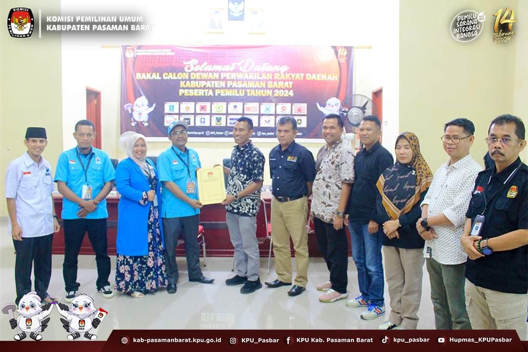 Rombongan partai diterima oleh Ketua KPU Kabupaten Pasaman Barat, Alharis dan Anggota Alfi Syahrin, Wanhar, Adri dan Misdarliah bersama Sekretaris KPU Kabupaten Pasaman Barat, Zaidi, didampingi Kasubbag Zamzami, Puput, Hidayat Basri, dan Yulia WN dan jajaran sekretariat serta disaksikan oleh Bawaslu Kabupaten Pasaman Barat.