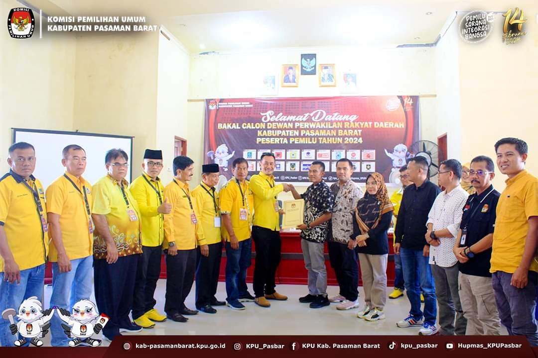Partai Golkar merupakan partai ke-10 yang mengajukan Bacalon DPRD ke KPU Kabupaten Pasaman Barat, setelah PKS, NasDem, PDI Perjuangan, PAN, Ummat, PBB, PKB, Hanura dan Gerindra. Kelengkapan berkas telah diterima dan selanjutnya akan di lakukan Verifikasi Administrasi pada tahapan berikutnya. (Hupmas-PB)