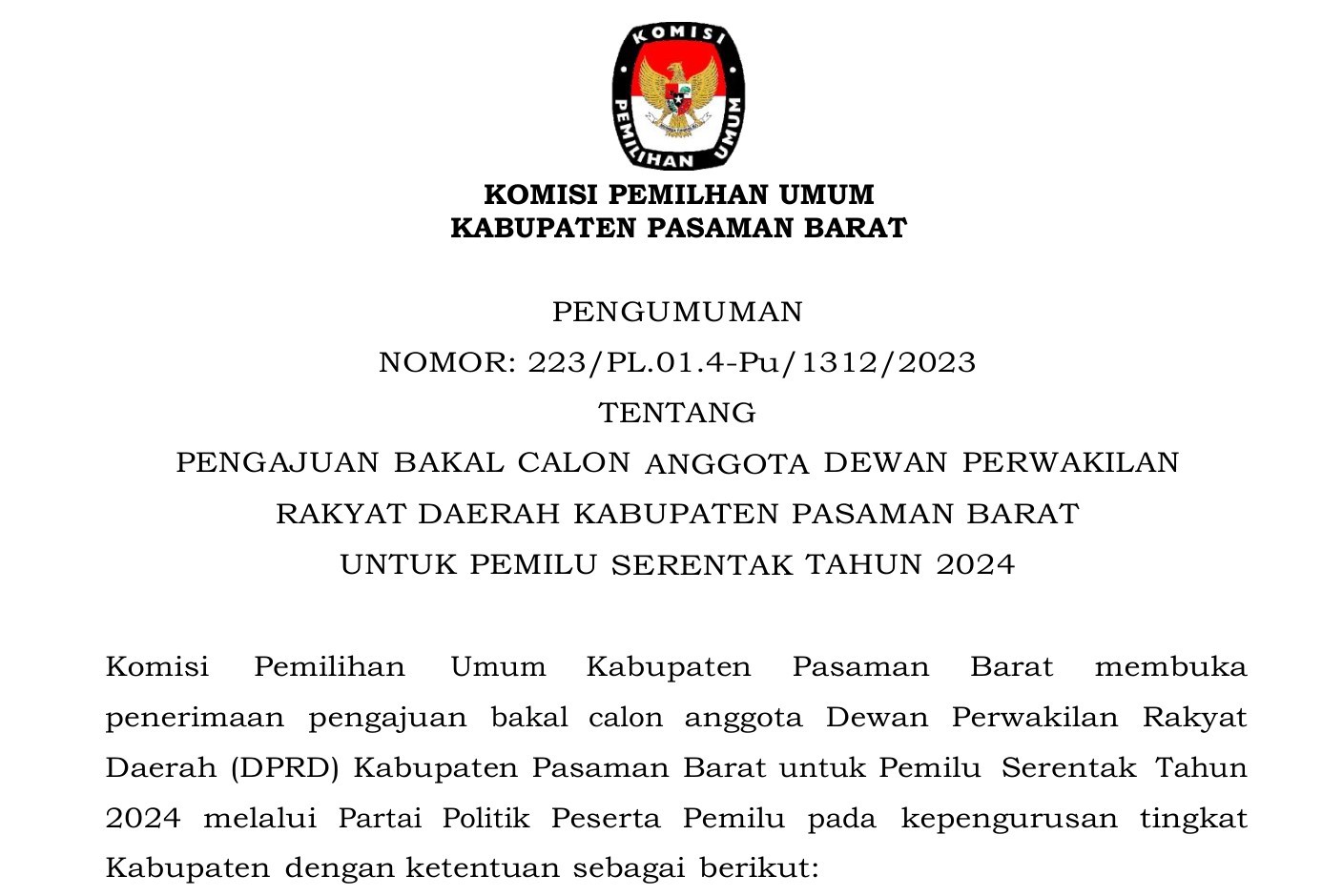 PENGAJUAN BAKAL CALON ANGGOTA DEWAN PERWAKILAN RAKYAT DAERAH KABUPATEN PASAMAN BARAT UNTUK PEMILU SERENTAK TAHUN 2024
