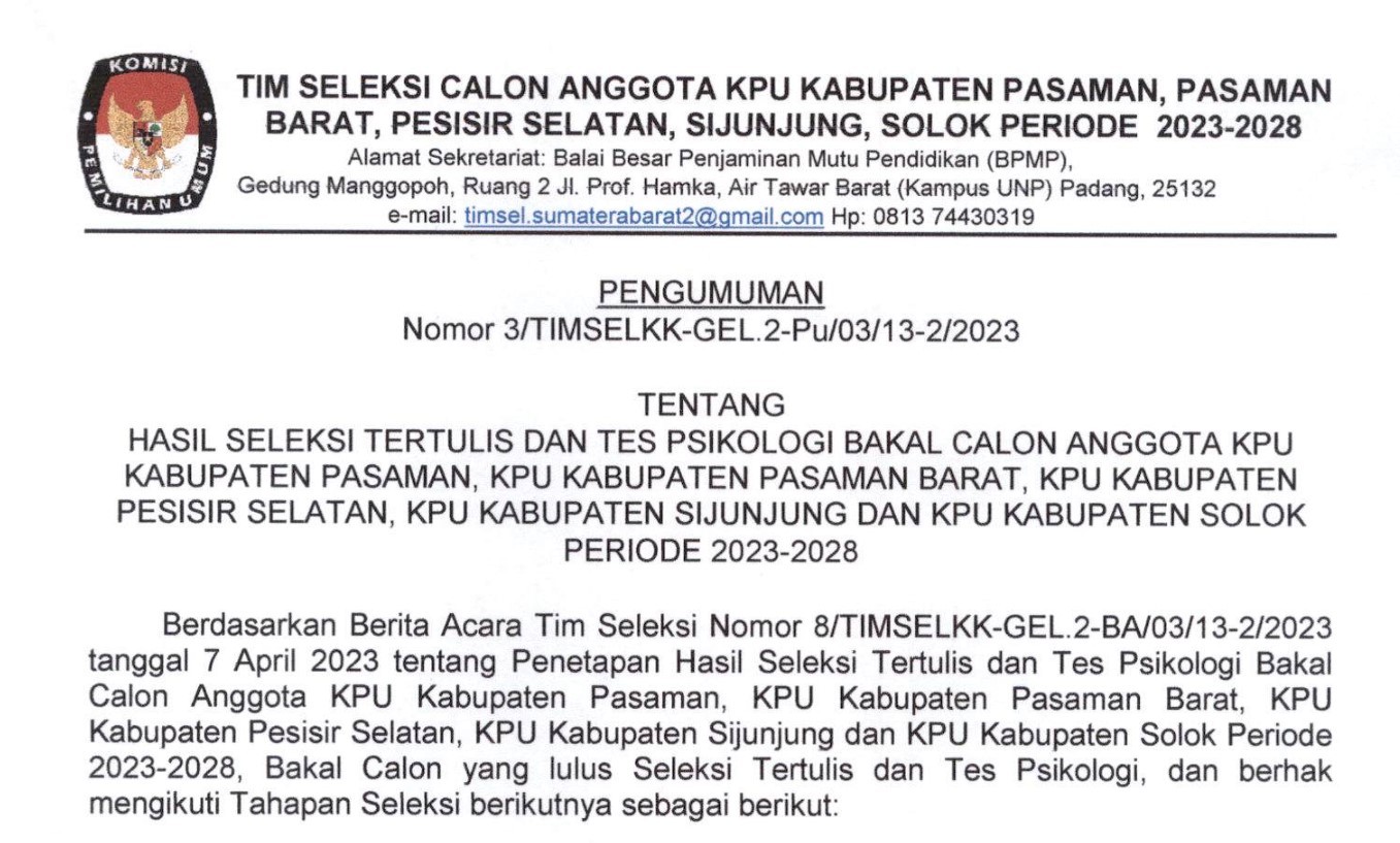 PENGUMUMAN HASIL SELEKSI TERTULIS DAN PSIKOLOGI BAKAL CALON ANGGOTA KPU KABUPATEN/KOTA SUMATERA BARAT 2
