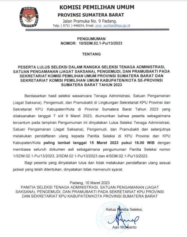 PENGUMUMAN LULUS SELEKSI TENAGA ADM, PENGAMANAN, PENGEMUDI, & PRAMUBAKTI DI KPU PROV/KAB/KOTA SE-SUMATERA BARAT TAHUN 2023