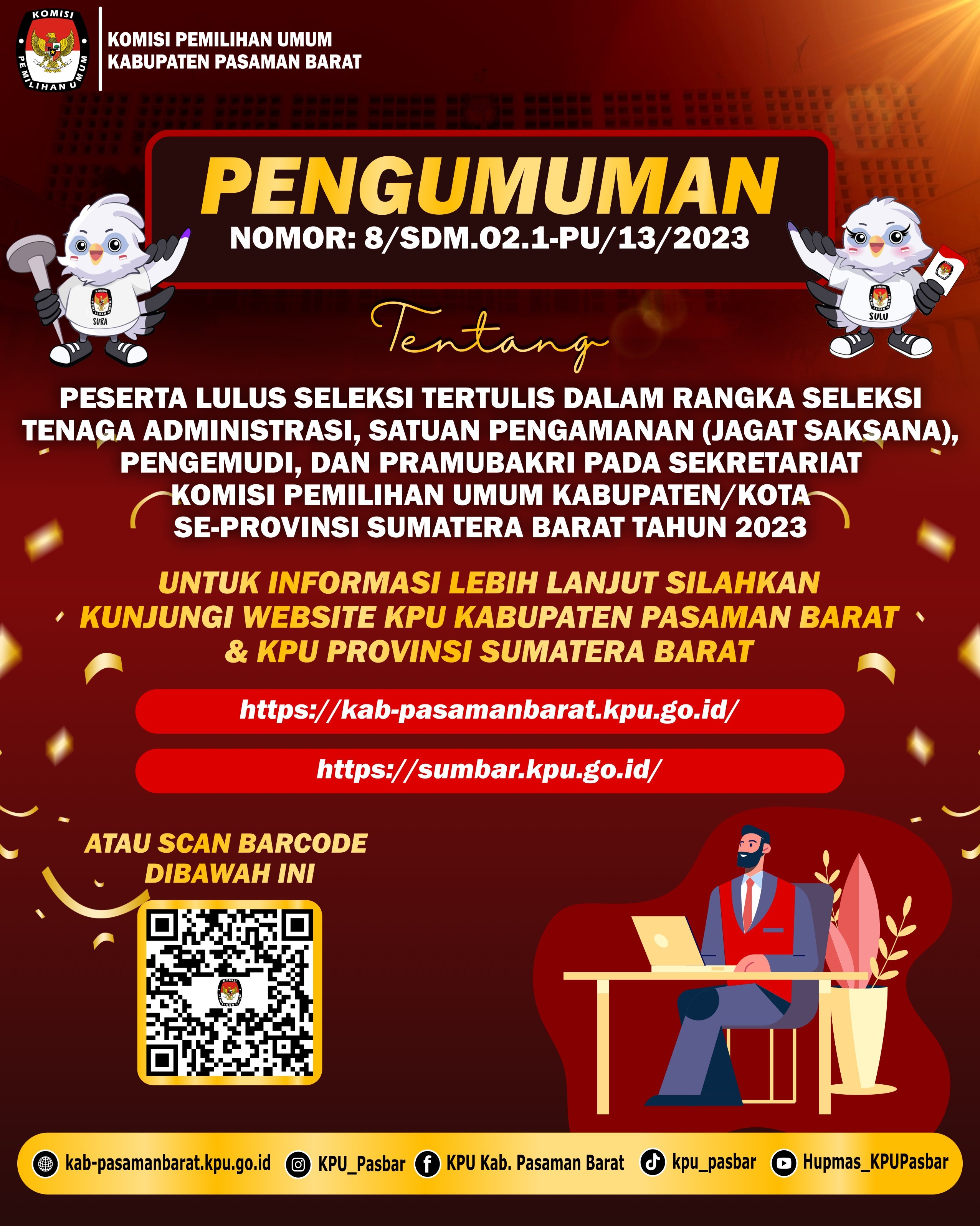 PENGUMUMAN LULUS SELEKSI TERTULIS TENAGA ADM, PENGAMANAN, PENGEMUDI, & PRAMUBAKTI DI KPU PROV/KAB/KOTA SE-SUMATERA BARAT TAHUN 2023