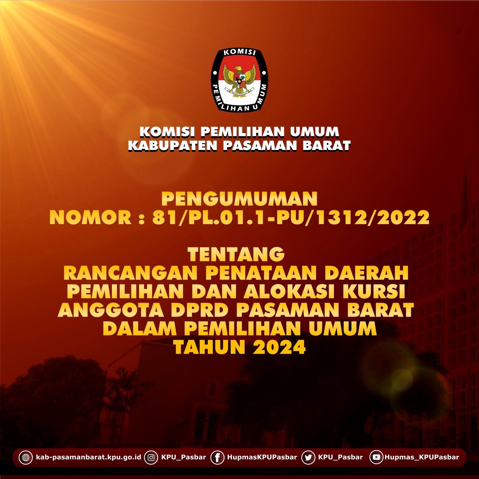 PENGUMUMAN NOMOR : 81/PL.01.1-Pu/1312/2022 TENTANG RANCANGAN PENATAAN DAERAH PEMILIHAN DAN ALOKASI KURSI ANGGOTA DEWAN PERWAKILAN RAKYAT DAERAH PASAMAN BARAT DALAM PEMILIHAN UMUM TAHUN 2024