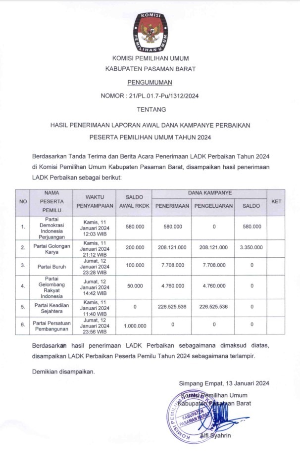 Pengumuman Penerimaan LADK Perbaikan Peserta Pemili Tahun 2024 Sabtu, 13 Januari 2024 20:00 360 untuk Download Pengumuman Bisa Klik Disini Bagikan: Dilihat 360 Kali.