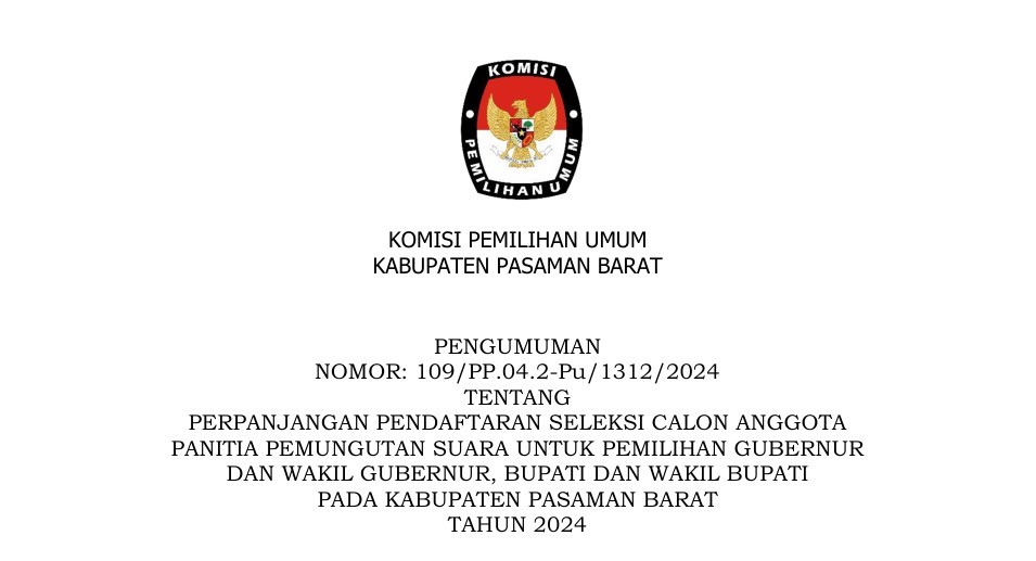 ERPANJANGAN PENDAFTARAN SELEKSI CALON ANGGOTA PANITIA PEMUNGUTAN SUARA UNTUK PEMILIHAN GUBERNUR DAN WAKIL GUBERNUR, BUPATI DAN WAKIL BUPATI PADA KABUPATEN PASAMAN BARAT TAHUN 2024