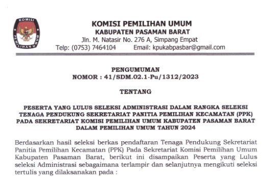 PENGUMUMAN NOMOR 41/SDM.02.1-PU/1312/2023 TENTANG YANG LULUS SELEKSI ADMINISTRASI DALAM RANGKA SELEKSI TENAGA PENDUKUNG SEKRETARIAT PANITIA PEMILIHAN KECAMATAN (PPK) PADA SEKRETARIAT KOMISI PEMILIHAN UMUM KABUPATEN PASAMAN BARAT DALAM PEMILIHAN UMUM TAHUN 2024