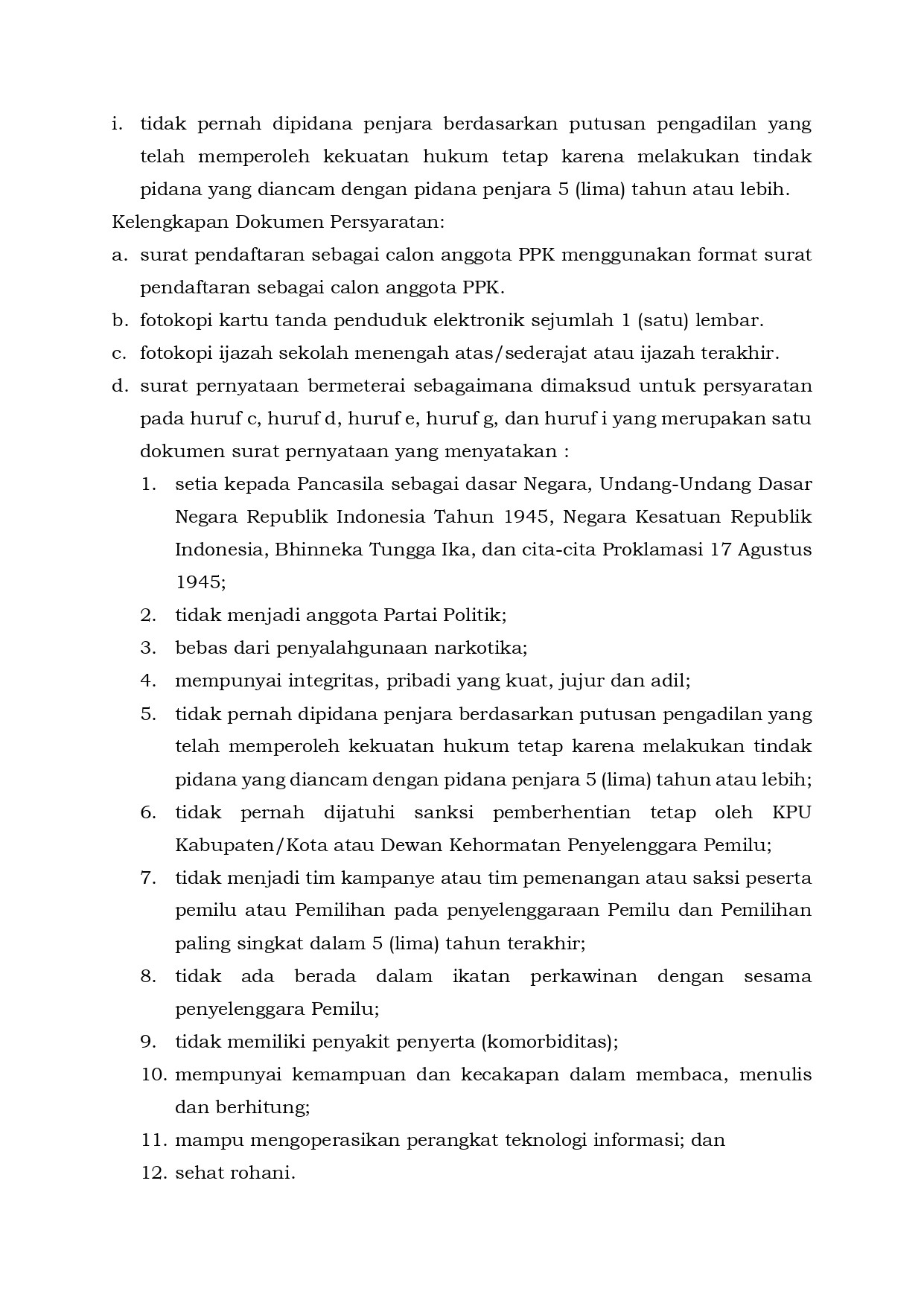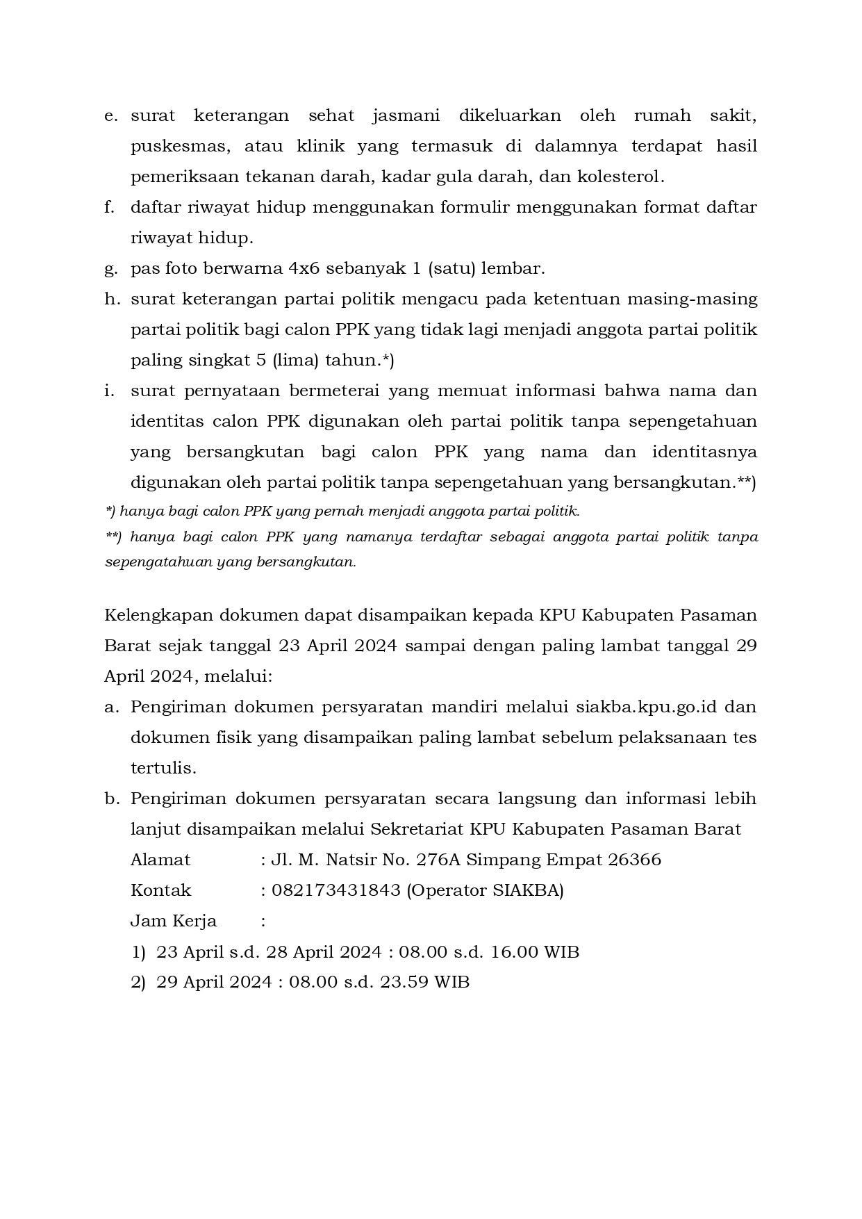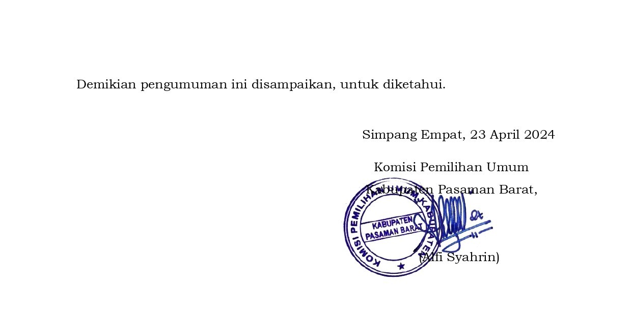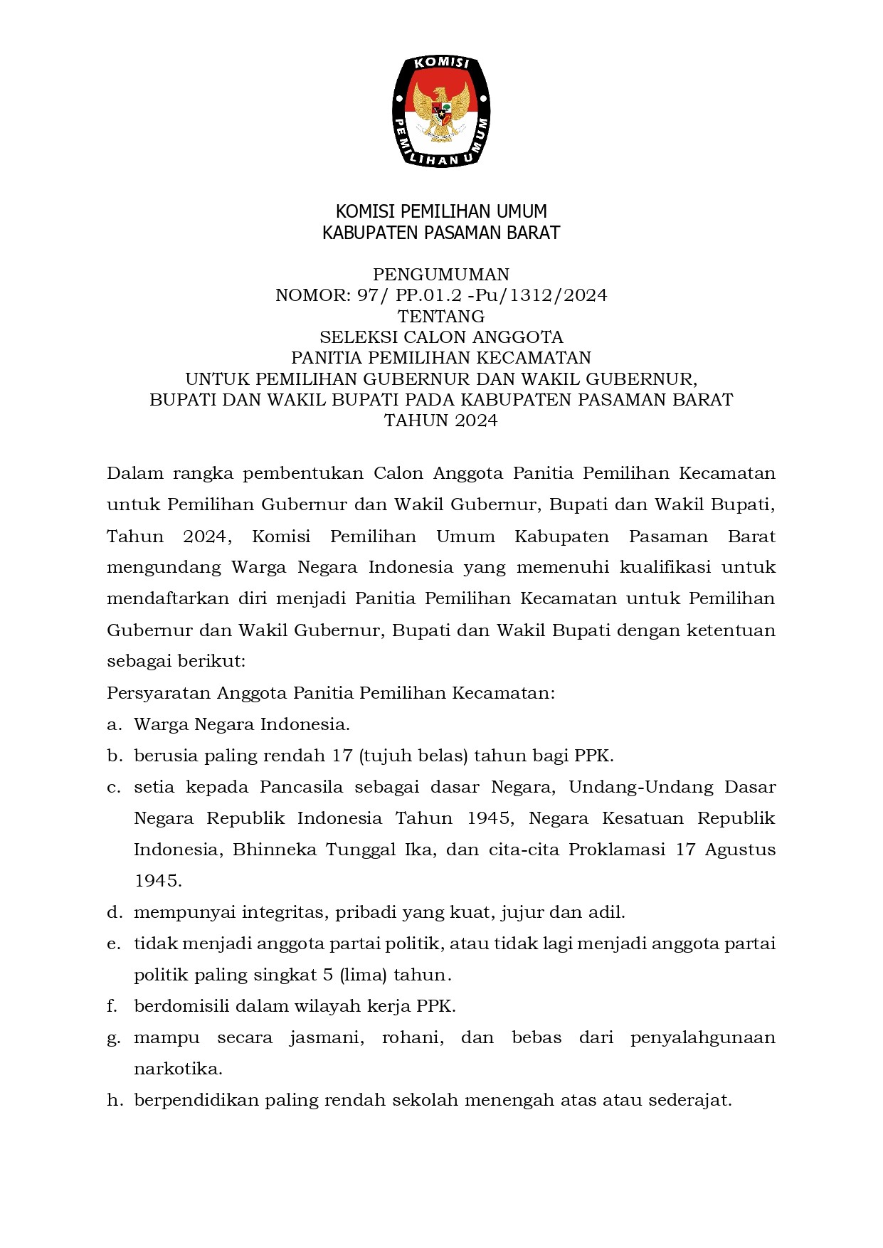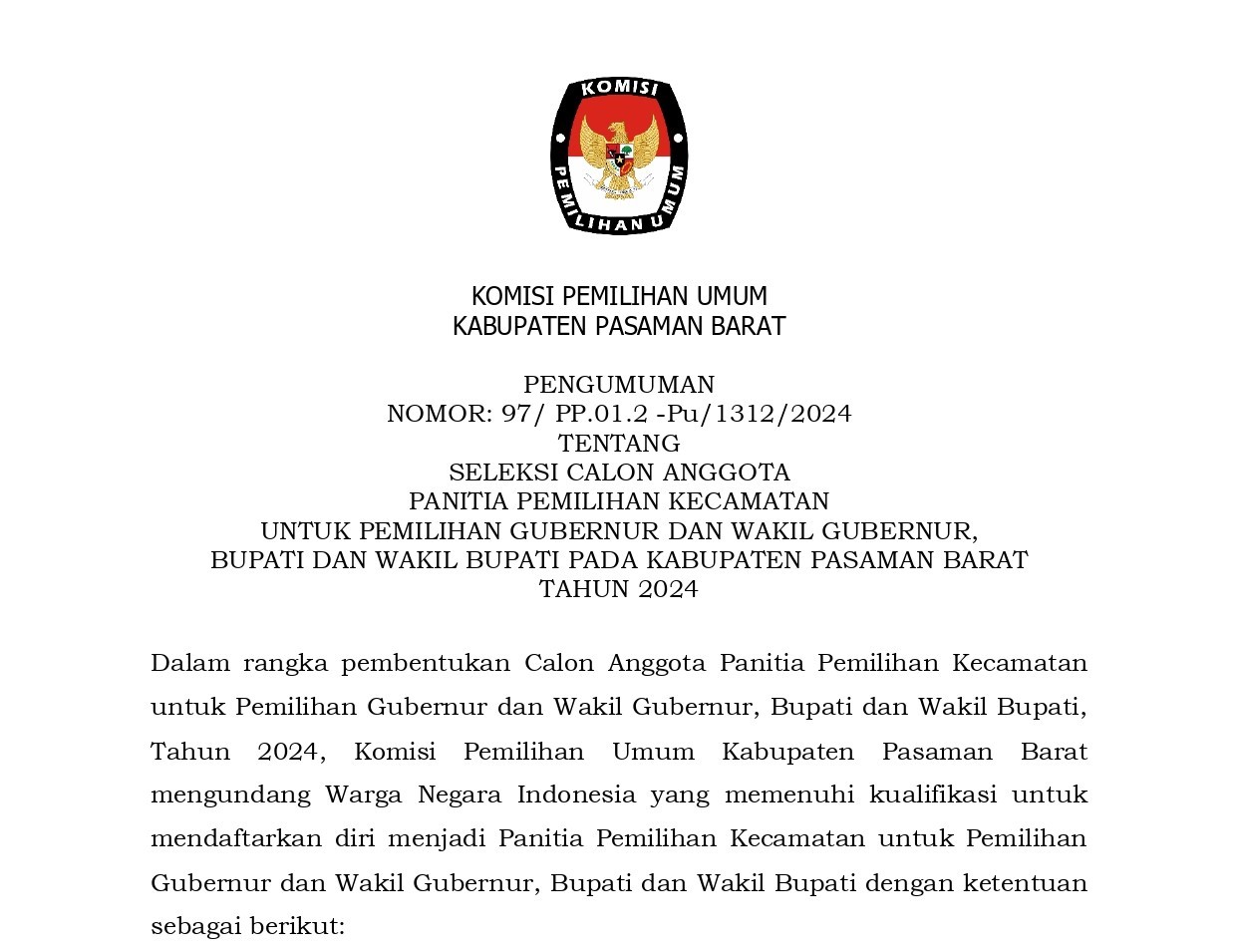 PENGUMUMAN SELEKSI CALON ANGGOTA PANITIA PEMILIHAN KECAMATAN UNTUK PEMILIHAN KEPADA DAERAH PADA KABUPATEN PASAMAN BARAT TAHUN 2024