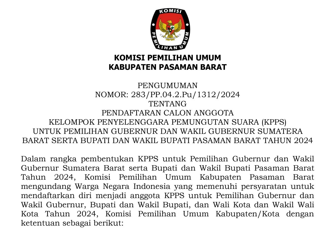 Dalam rangka pembentukan KPPS untuk Pemilihan Gubernur dan Wakil Gubernur Sumatera Barat serta Bupati dan Wakil Bupati Pasaman Barat Tahun 2024, Komisi Pemilihan Umum Kabupaten Pasaman Barat mengundang Warga Negara Indonesia yang memenuhi persyaratan untuk mendaftarkan diri menjadi anggota KPPS untuk Pemilihan Gubernur dan Wakil Gubernur, Bupati dan Wakil Bupati, dan Wali Kota dan Wakil Wali Kota Tahun 2024, Komisi Pemilihan Umum Kabupaten/Kota dengan ketentuan sebagai berikut: