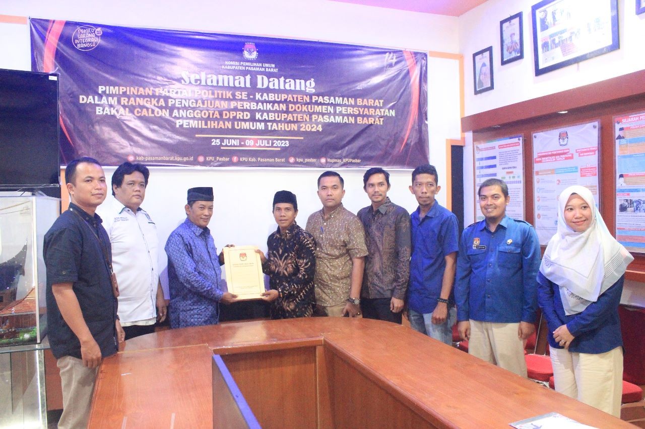 PKB menjadi partai ke-dua yang telah mengajukan perbaikan dokumen persyaratan Bakal Calon Anggota DPRD ke KPU Kabupaten Pasaman Barat setelah PPP. Usai dilakukan verifikasi berkas oleh tim verifikator maka status pengajuan perbaikan dokumen persyaratan Bacalon Anggota DPRD dari PKB dinyatakan diterima.