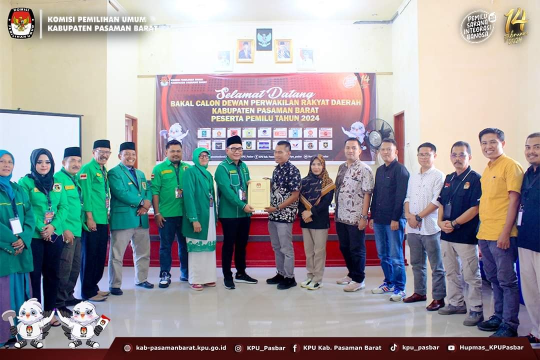 PPP merupakan partai ke-11 yang mengajukan Bacalon DPRD ke KPU Kabupaten Pasaman Barat, setelah PKS, NasDem, PDI Perjuangan, PAN, Ummat, PBB, PKB, Hanura, Gerindra dan Golkar. Kelengkapan berkas telah diterima dan selanjutnya akan di lakukan Verifikasi Administrasi pada tahapan berikutnya. (Hupmas-PB)