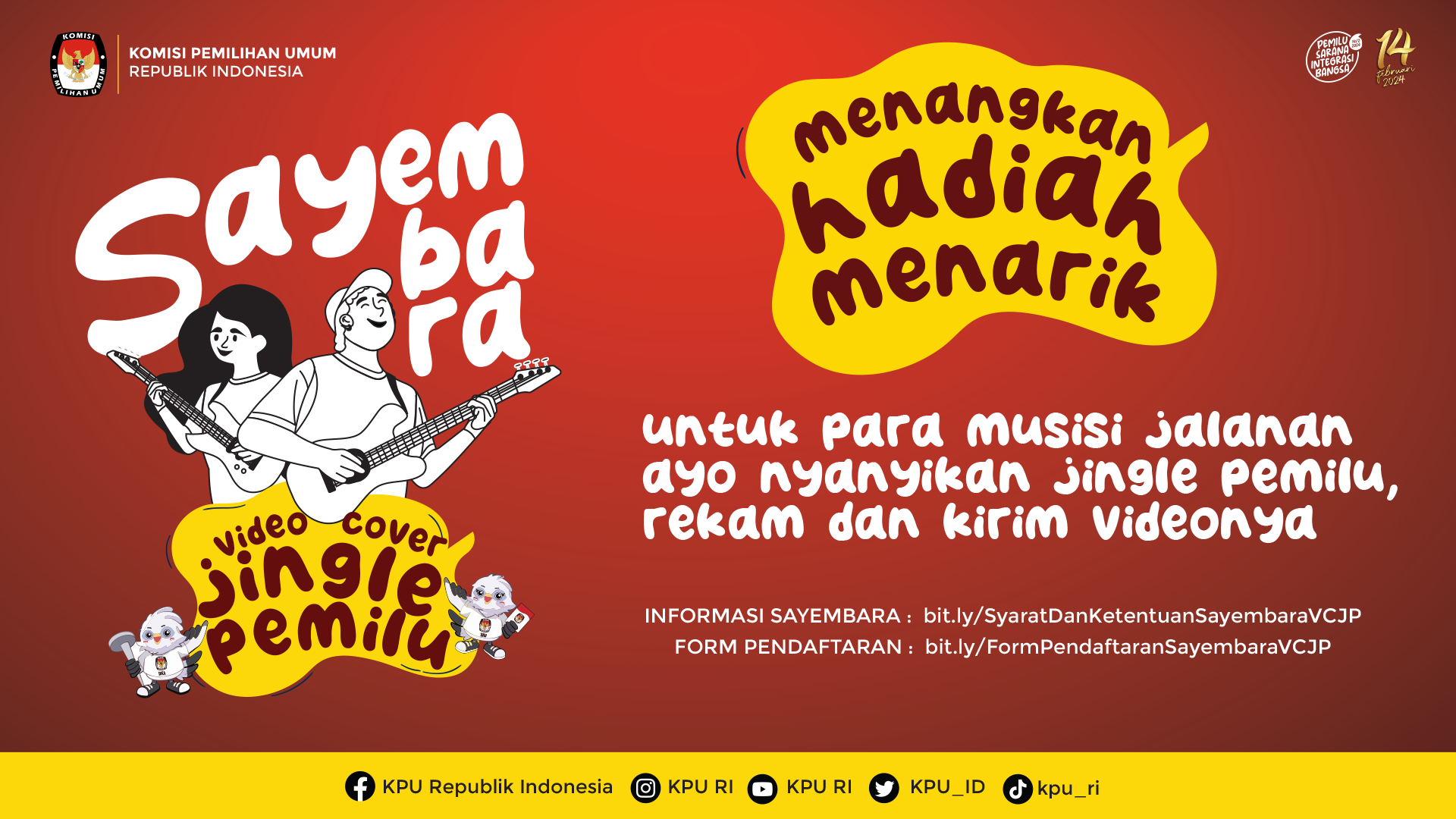 - Peserta menyanyikan Jingle Pemilu 2024 sesuai dengan lirik lagu di link berikut: https://www.kpu.go.id/berita/baca/11257/maskot-pemilu-serentak-tahun-2024-sura-sulu;